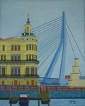 2012Vanaf de Veerhaven doorkijk naar de Rotterdamse Zwaan met links het Wereldmuseum uitgebeeld. Voorstelling is met olieverf op linnen doek geschilderd.
