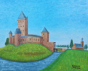 2010Het kasteel Weijenburg is de trouwlocatie van mijn dochter Marijke. Vanuit zicht op de hoofdentree met op de achtergrond de Protestante kerk van Echteld is het kasteel uitgebeeld. Voorstelling is met olieverf op linnen doek geschilderd.