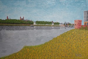 2016Uitzicht op de torens van Maastricht met Sint-Servaasbrug gezien vanaf “het Wyck” nabij de Maaspunttoren/Lambrechtsrondeel. De voorstelling is met olieverf op paneel geschilderd.