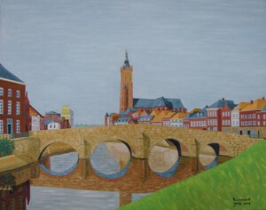 2010De Sint-Chrisstoffelkathedraal heeft nog steeds een prominente rol boven de Maria-Theresiabrug(stenen brug) in Roermond. Voorstelling is met olieverf op linnen doek geschilderd.